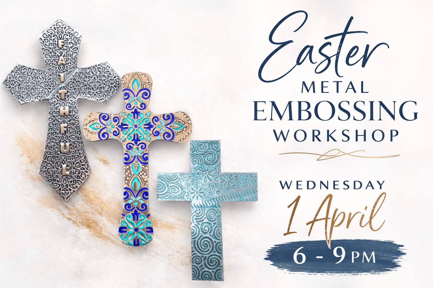 Join me for a beautiful evening of creativity and connection as you design your own embossed metal cross.