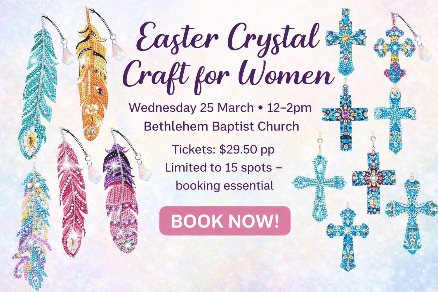 Take a break, connect with beautiful women of faith, and enjoy a relaxing afternoon creating your own stunning crystal feather or cross design—perfect to keep or gift this Easter season.